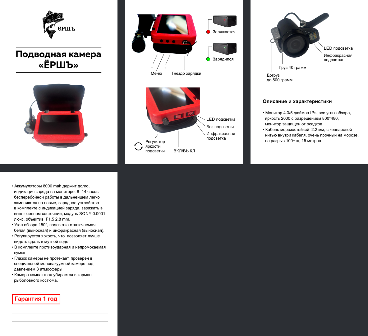 Камера оснащена 4,3/5 дюймовым монитором, с хорошим разрешением, ips 800/480, прочным морозоустойчивым проводом с кевларовой нитью, длиной 15/20/25/30 метров и толщиной 2,2мм. Матрица Sony CCD HD с крафтовой прошивкой, что обеспечивает отличное изображение. Две выносные подсветки с регулятором мощности ИК и LED (Инфракрасная и тепло белая подсветка), также функция полного отключения всех подсветок. Из приятного: имеет индикацию заряда батареи, АКБ 4500 mah, заряда хватает до 14 часов бесперебойной работы устройства. В комплекте противоударный, водонепроницаемый чехол для транспортировки, зарядное устройство на выбор. 5 цветовых решений корпуса: черный, красный, синий, оливковый, желтый. Гарантия на устройства 1 год, а также ТО и ремонт.
